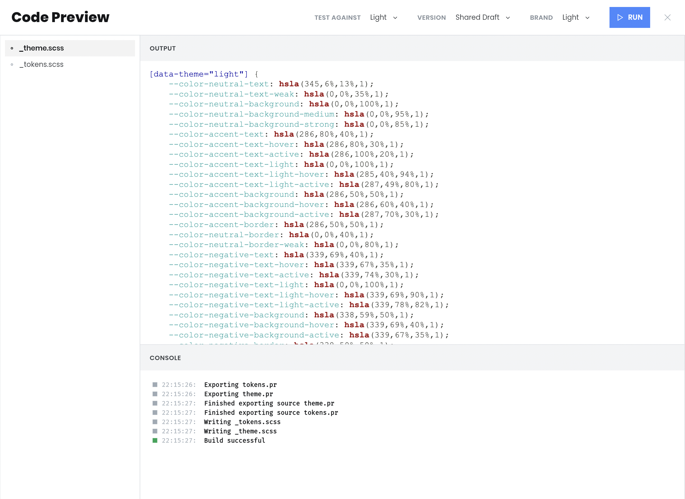 This exporter translates our tokens into CSS custom properties.